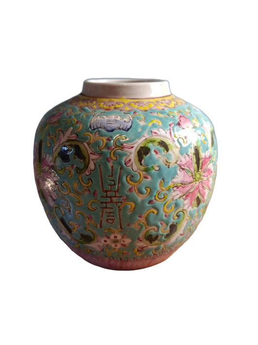 Chinese Famille Rose Ginger Jar with a turquoise background and a Mun Shou floral design