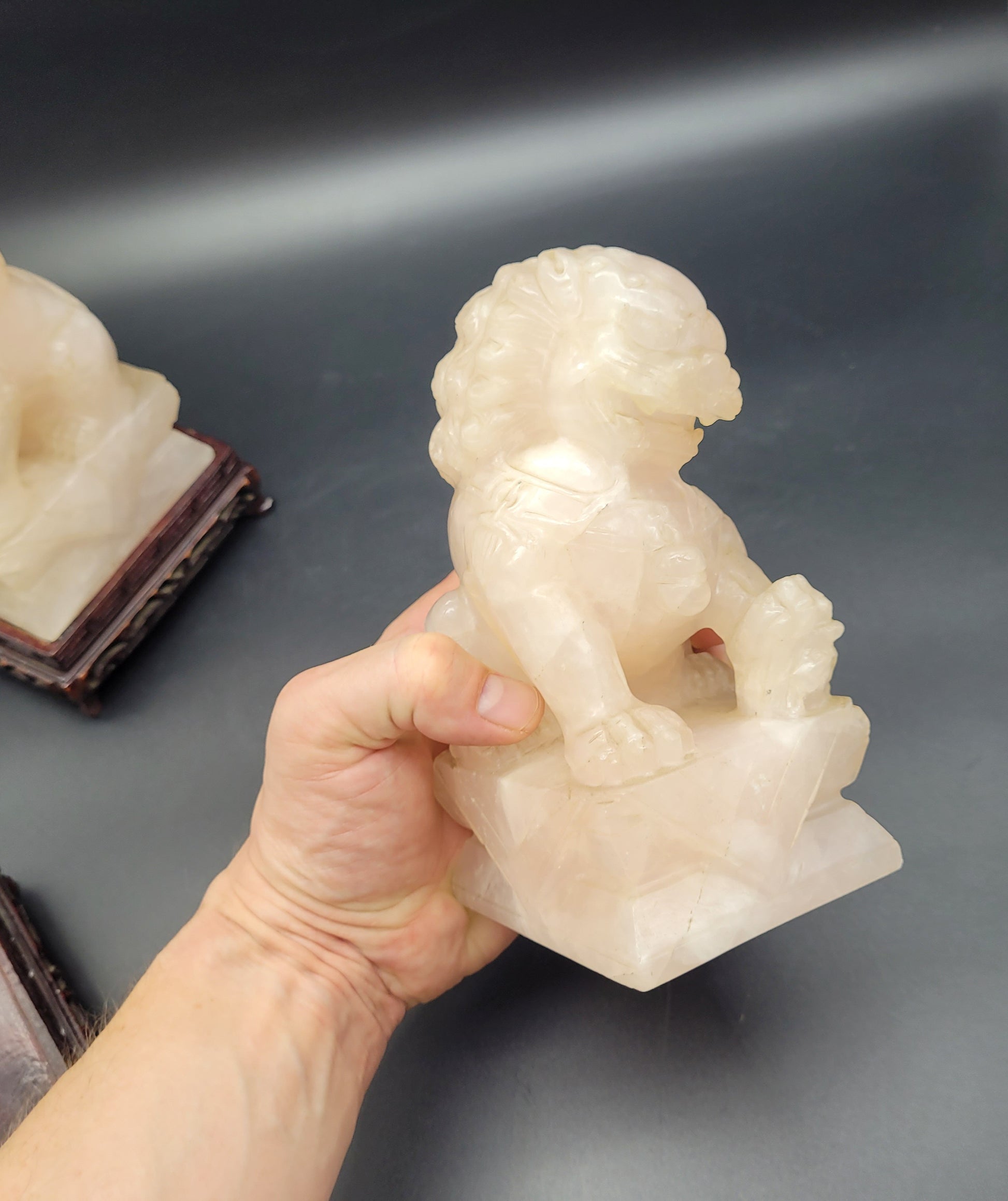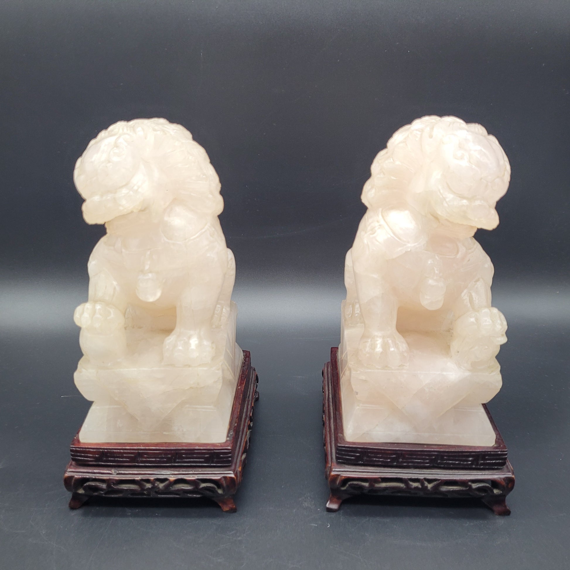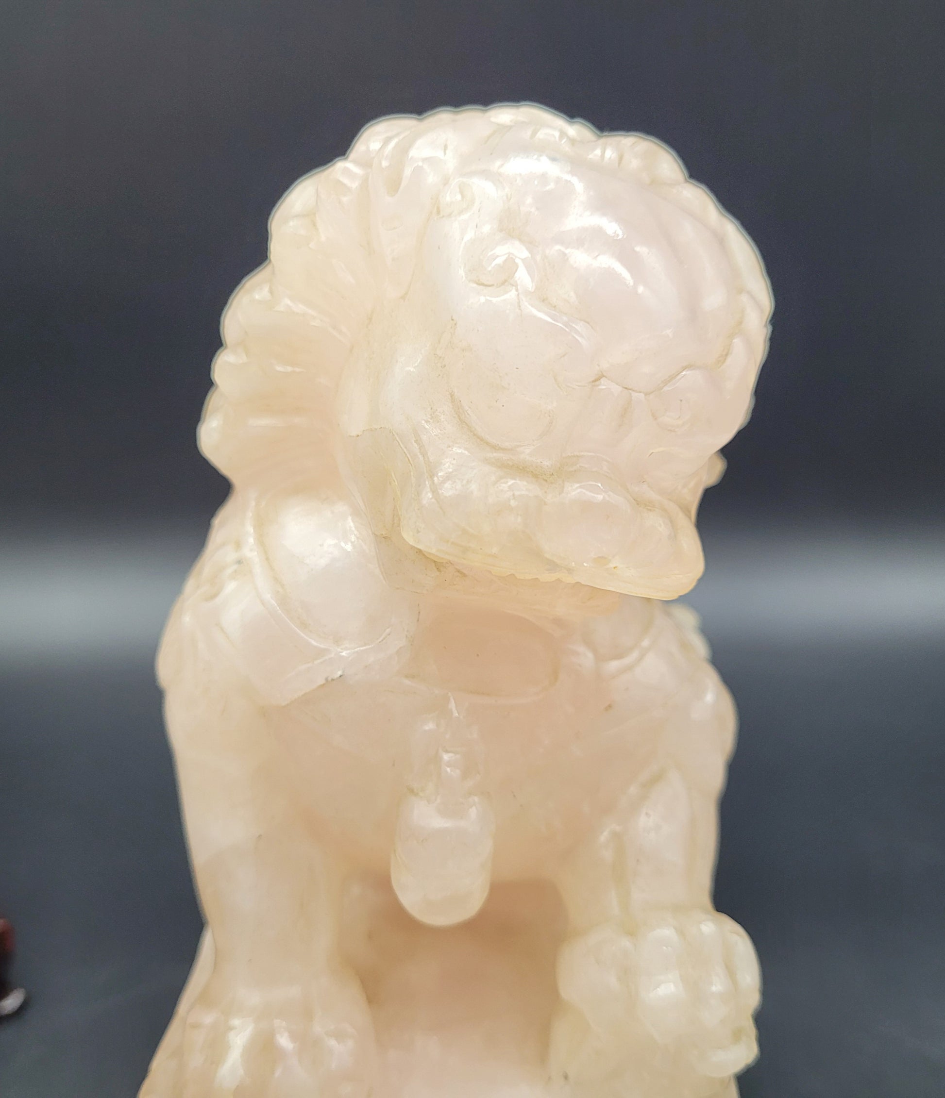 Chinese Antique Foo Dog ROSE QUARTZ Carvings Temple Dogs With Carved Wooden Stands