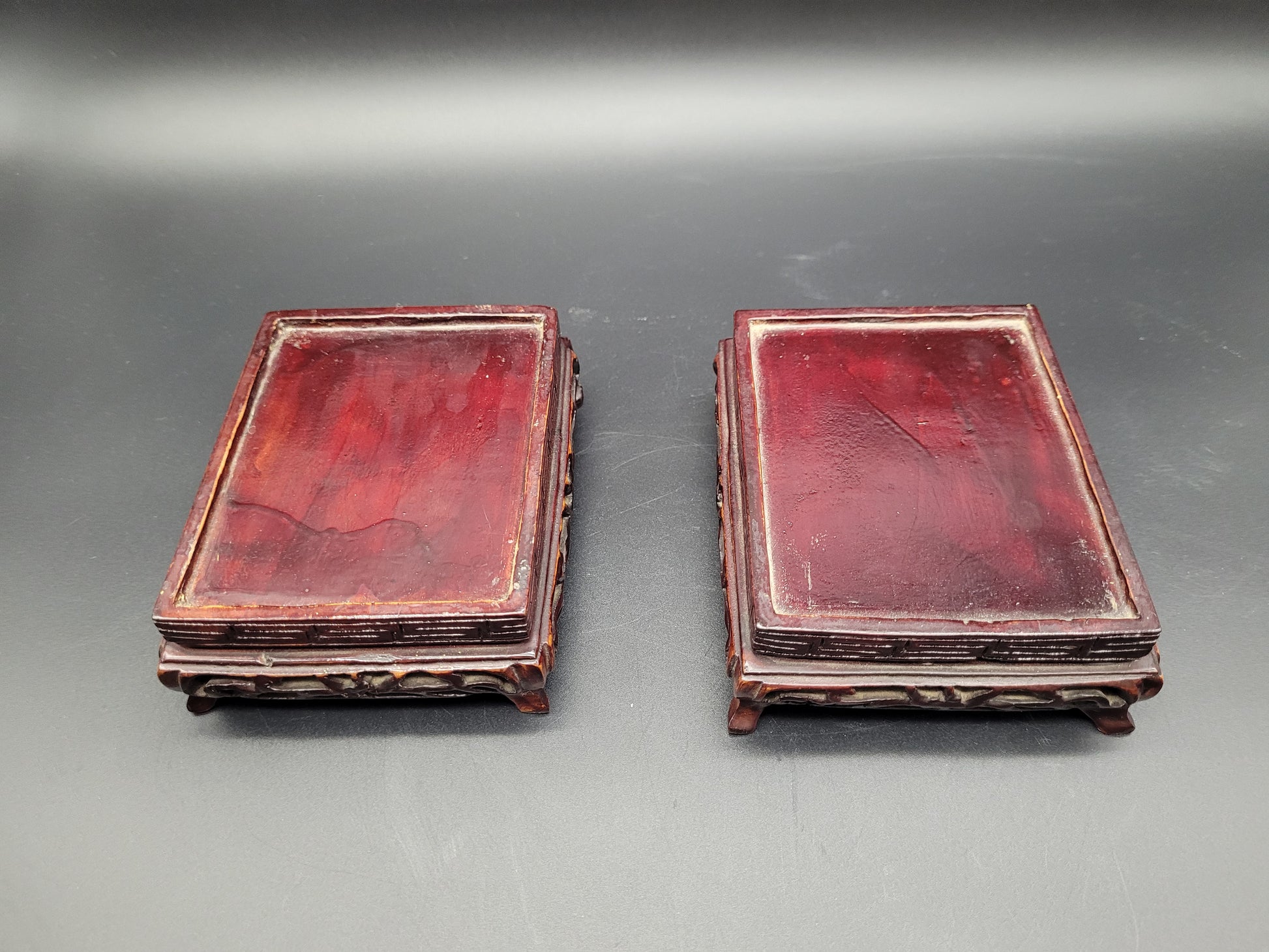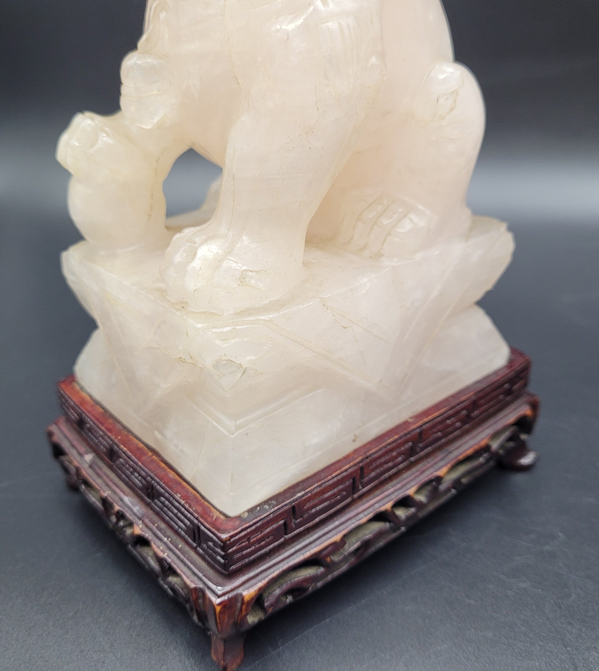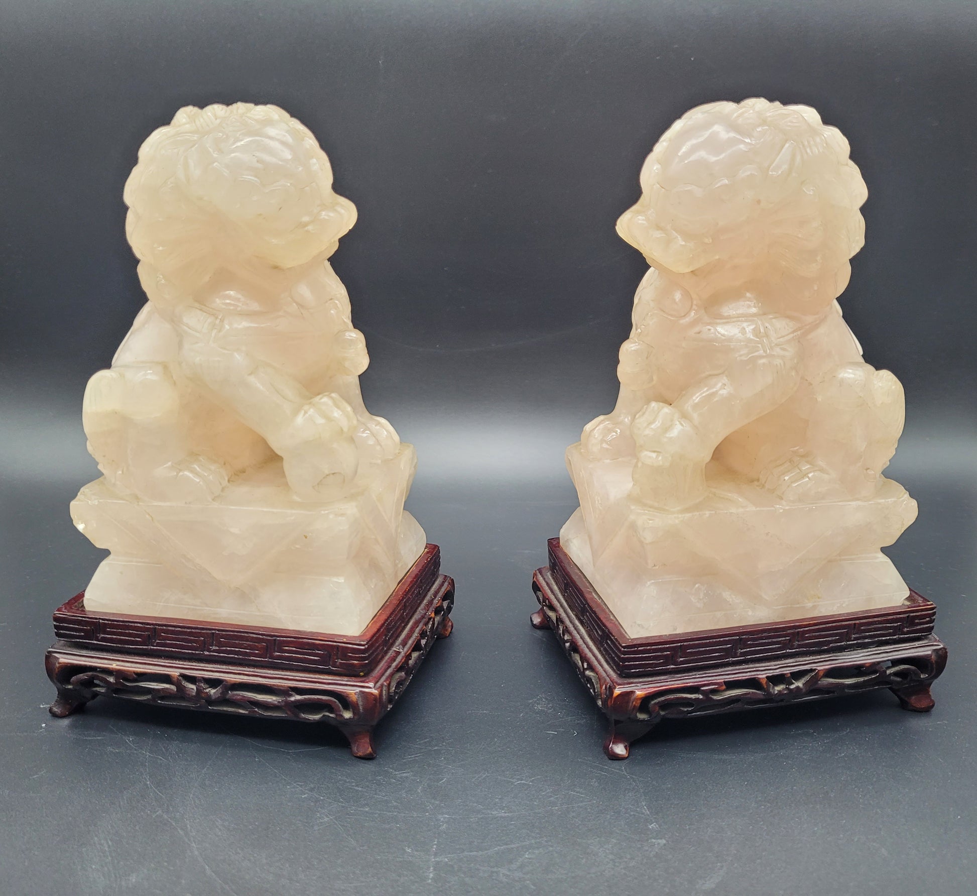 Chinese Antique Foo Dog ROSE QUARTZ Carvings Temple Dogs With Carved Wooden Stands