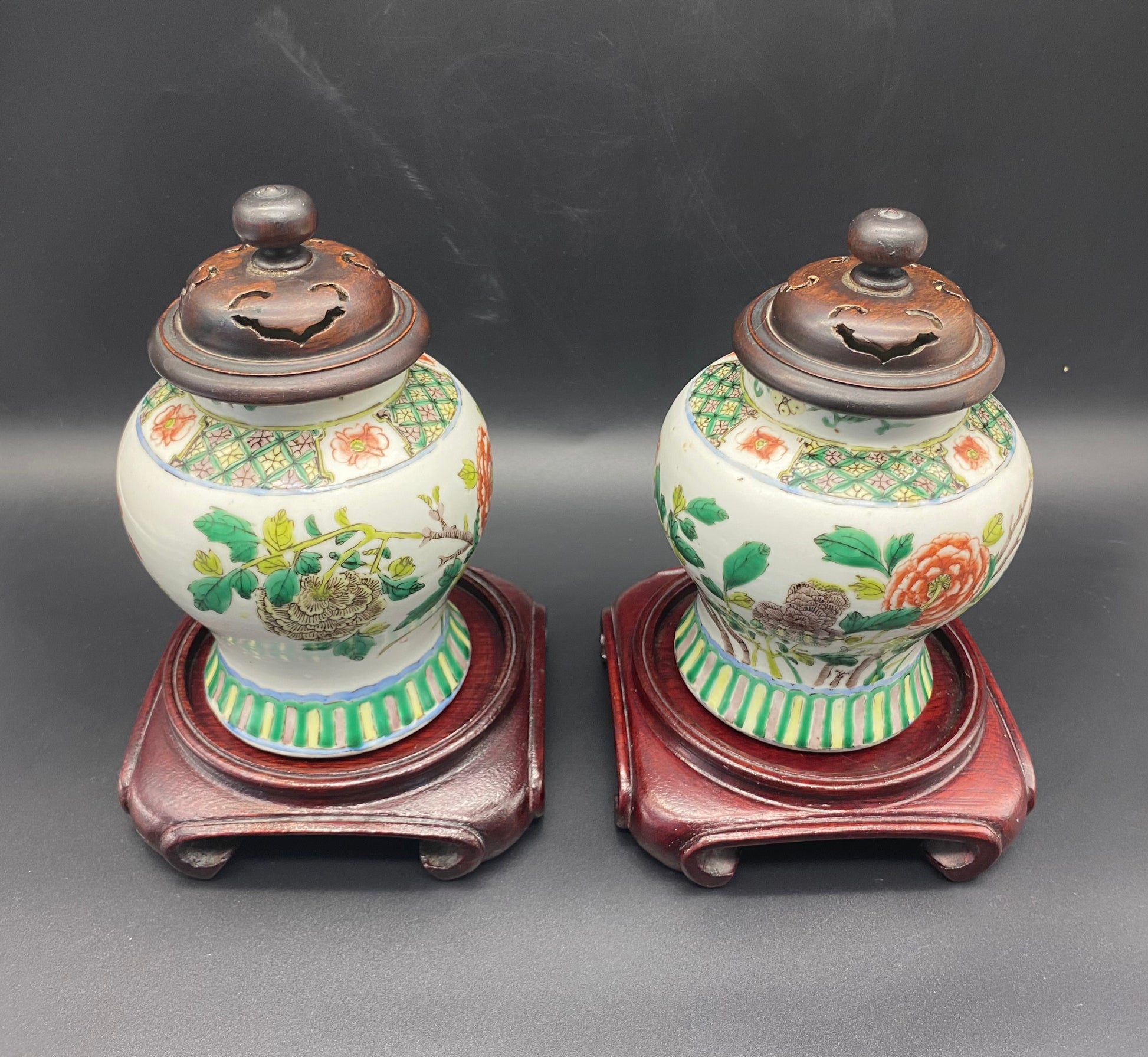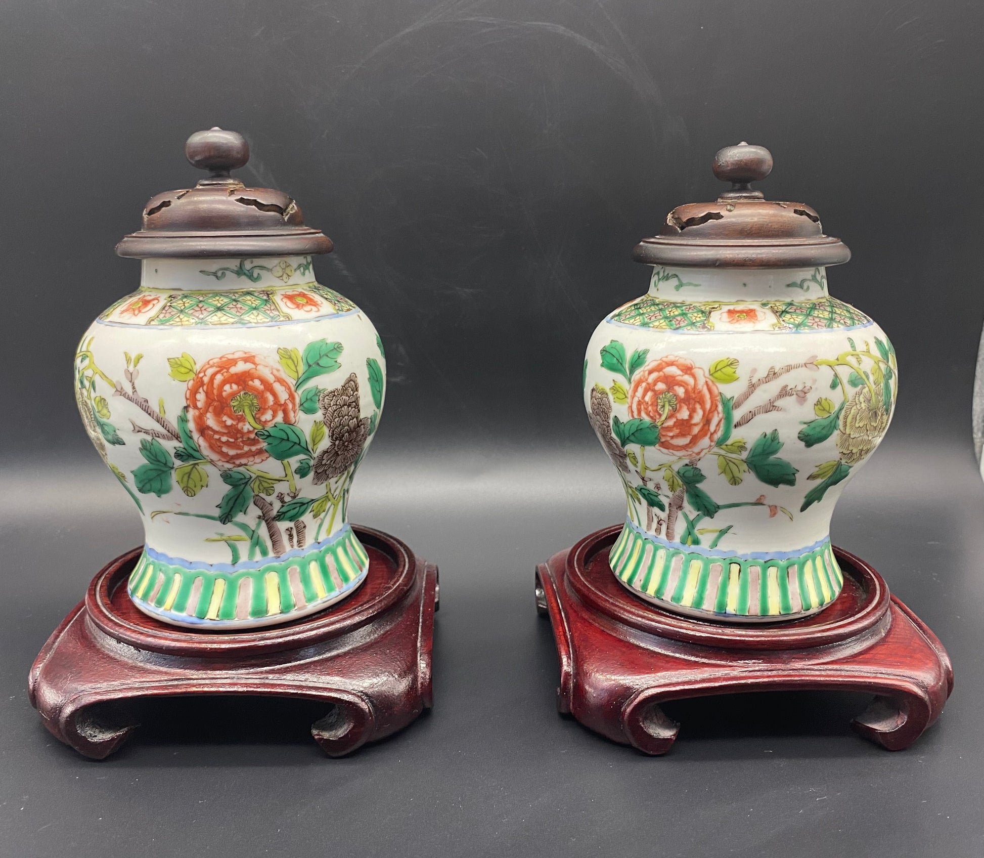 Chinese 19th Century Famille Vert Porcelain Ginger Jars with Carved Wooden Lids And Carved Wooden Stands.