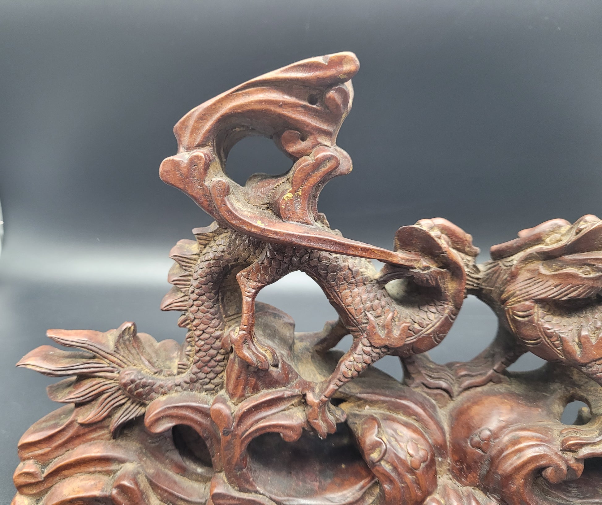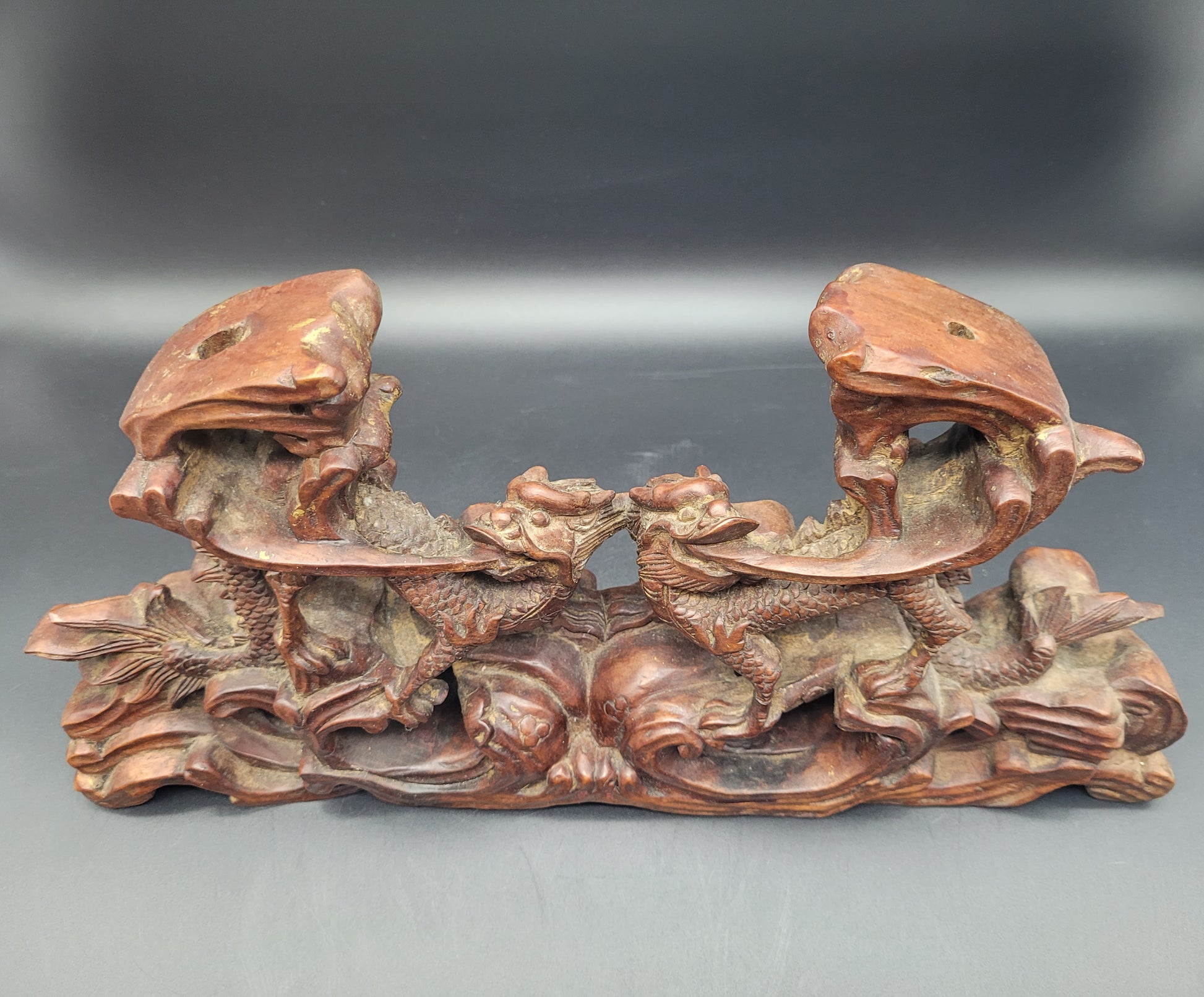 Chinese Qing Carved Wood Stand of Two Opposing Dragons Standing on Waves ( Estate Find )