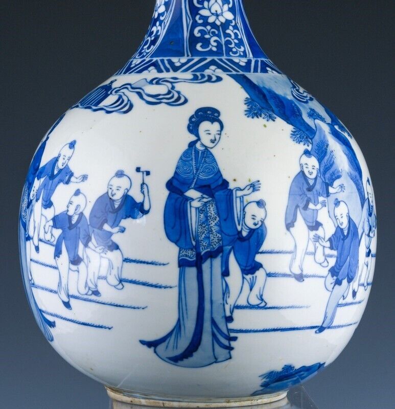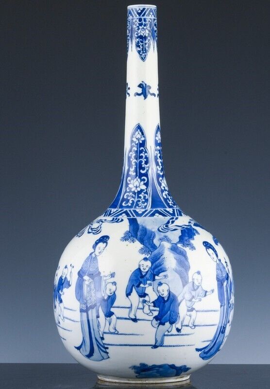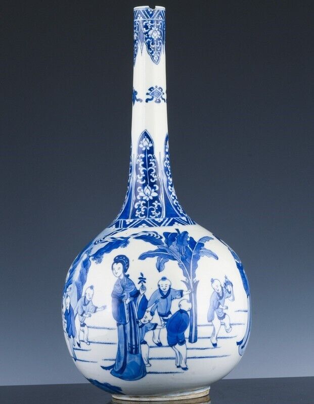 An impressive extra-large size example dating from the Kangxi period. The vase has a beautiful imperial attendants with playing children figural landscape design that surrounds the entire body. The vase has some transitional period influences indicating that the vase likely dates from the earlier Kangxi period. The vase is one of the larger size Kangxi period bottle vases we have personally ever seen. The vase is a wonderful example to study in person. The vase has some minor damage to the top rim that is well worth having restored if desired. This great, and we believe rarely found example is being offered Without Reserve!